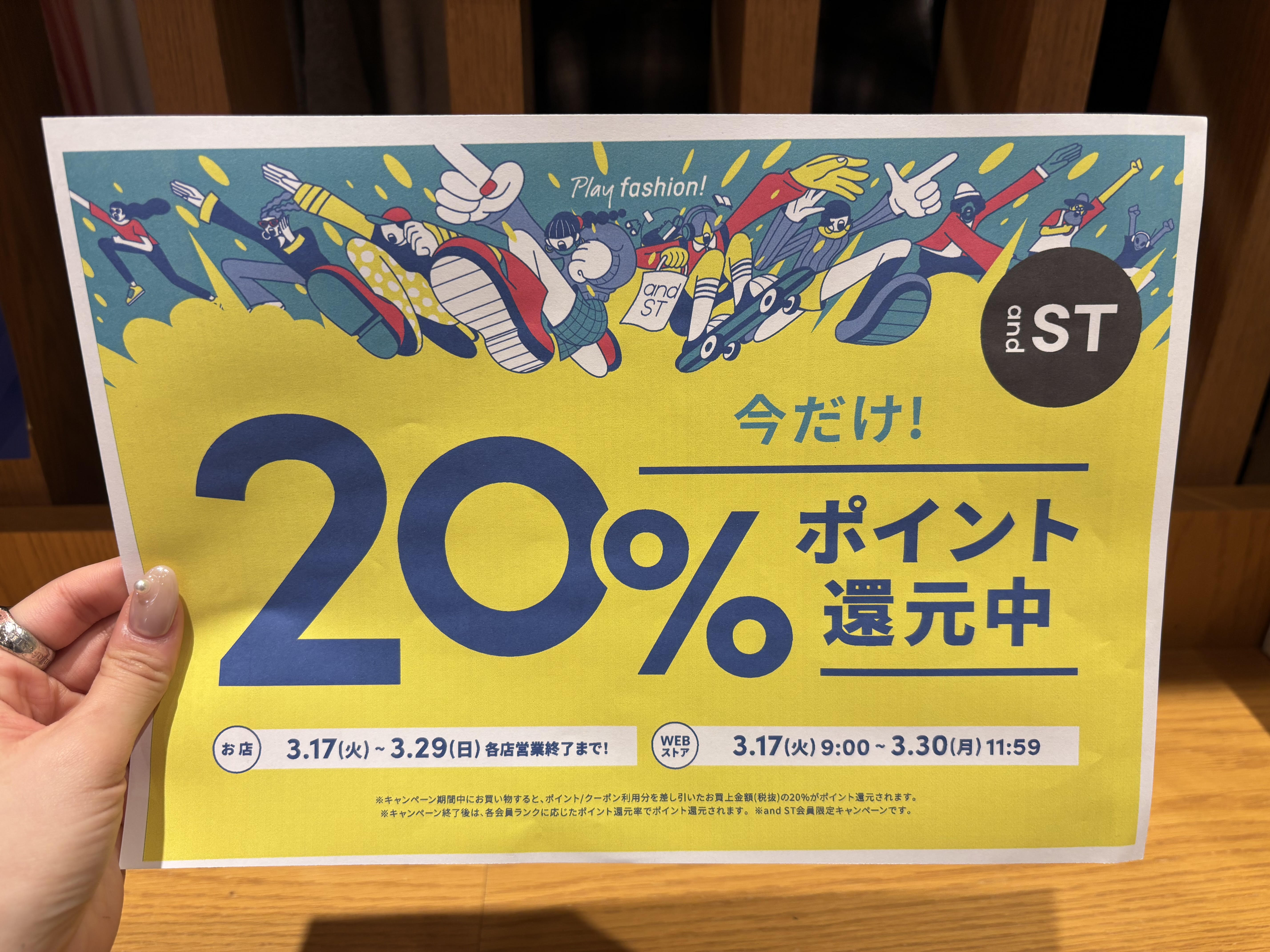 3/17(火)~3/29(日)の期間andST会員様限定でポイント20%還元キャンペーンが開催されます!当日のご登録でもポイント付与の対象になりますので是非お求めの際はお近くのスタッフにお声かけ下さい^^