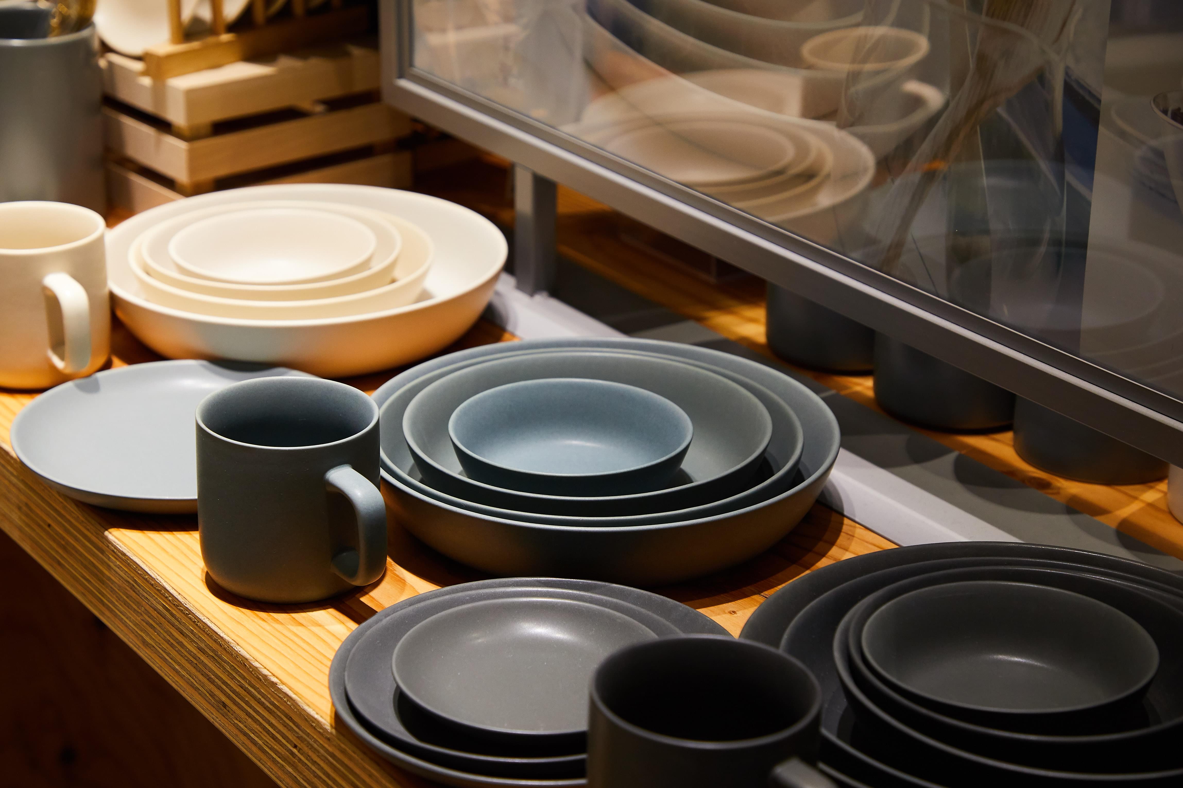 デザイン性が高く、使いやすさを考えた尺貫法の設計。重なりも美しい高台のない食器です。平皿、深皿各種を白、黒、グレー、ブラウン、ネイビーの5色で展開。サイズは5種類用意しています。
