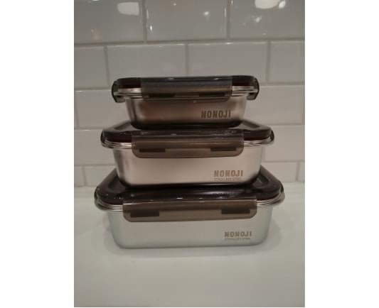 ステンレスのシルバーと濃いグレーのフタの組み合わせがとてもスタイリッシュで、高級感があって保存容器には見えません。この見た目で電子レンジ可能と聞いて、とても欲しくなりました。ステンレス製だと色移りを心配しなくていいですし、油が多いおかずも気軽にチンできるのが良いです。オーブンにも対応、冷凍も食洗機もOKと本当に便利です。フタはシリコン製で液もれしにくい仕様なので、お弁当箱として使っている方も多いそうです。大きいサイズなら、運動会の時はお弁当箱としても使えるなと思いました。3つのサイズがあって、フタをしたままでもすべて入れ子として収納できるので、フタが無くなったりしないのも助かります。