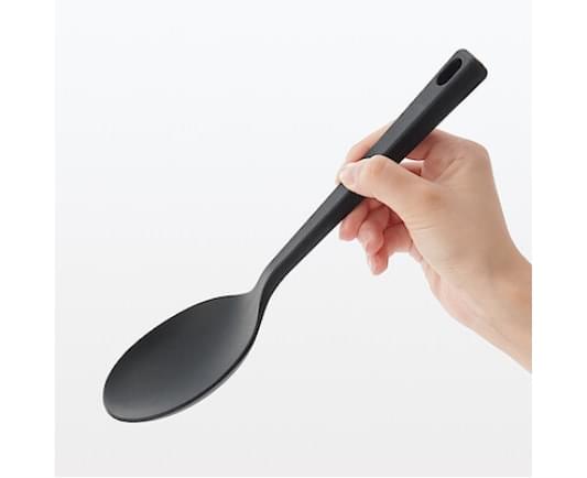 耐熱温度の高いシリコーン素材を使った、調理や取り分け時に役立つ調理スプーンです。先端の適度なしなりが鍋肌に沿い、食材を無駄なくすくい取ります。色は食材による色移りが目立たないよう黒色にしています。