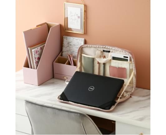 テレワーク生活に便利なPCケースです。内側にPCスタンドがあり、ノートパソコンを斜めに立て掛けて使用できます。収納ポケット付きでツールスタンドとしても活躍します。