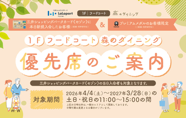 三井ショッピングパークカード《セゾン》当日新規入会者&プレミアムメダルのお客様限定 1Fフードコート森のダイニング 優先席のご案内