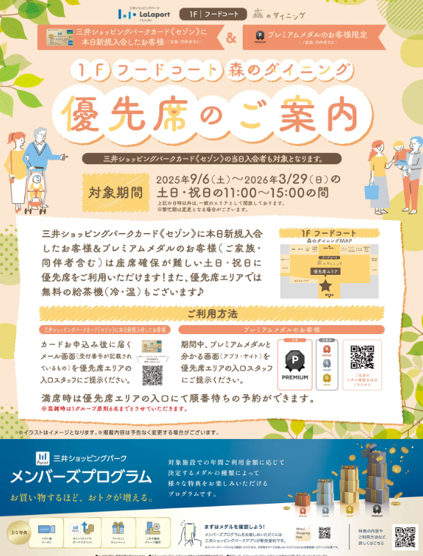 - 三井ショッピングパークカード《セゾン》当日新規入会者&プレミアムメダルのお客様限定 1Fフードコート森のダイニング 優先席のご案内