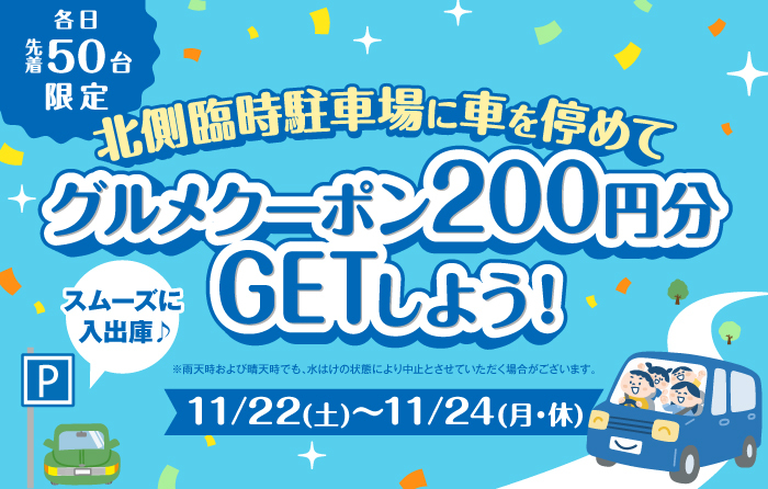 11/22(土)~24(月・休)の期間、北側臨時駐車場に車を停めていただくと、