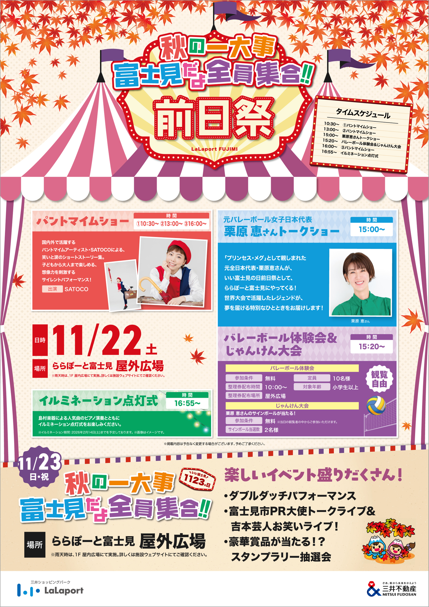 SATOCOのパントマイム、栗原恵さんトーク&体験、イルミネーション点灯式など、笑顔と感動が詰まった前日祭です!