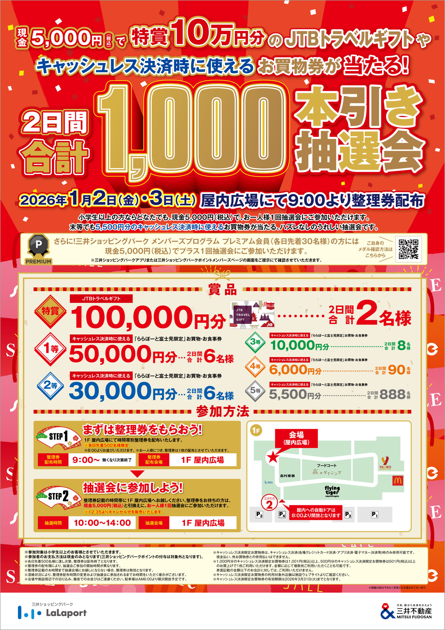 さらに!三井ショッピングパーク メンバーズプログラム プレミアム会員様(各日先着30名様)については、現金5,000円(税込)でプラス1回抽選会にご参加いただけます!