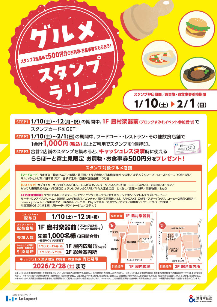 期間中、フードコート・レストラン・その他飲食店舗で1会計1,000円(税込)以上ご利用いただいた方にスタンプを1個押印。