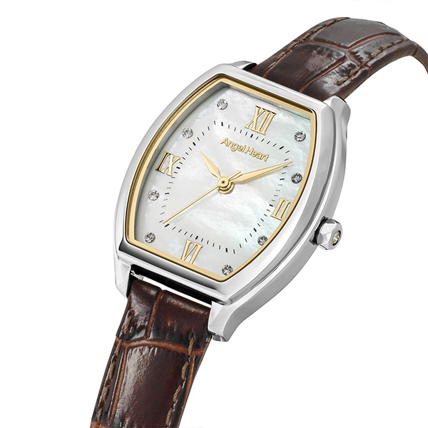 お求めいただきやすいエントリーライン初のトノー型ウォッチが登場。こちらは TiCTAC限定モデル。 シンプルなホワイトにローマ数字をあしらったタイムレスなデザインに、8石のクリスタルを施し、エンジェルハートらしい可愛さをプラス。 ほのかな光沢感が魅力のブラウンレザーベルトは、カジュアルにもフォーマルにも合わせやすく、毎日のコーディネートに活躍します。 60メモリ付きで視認性にも優れています。