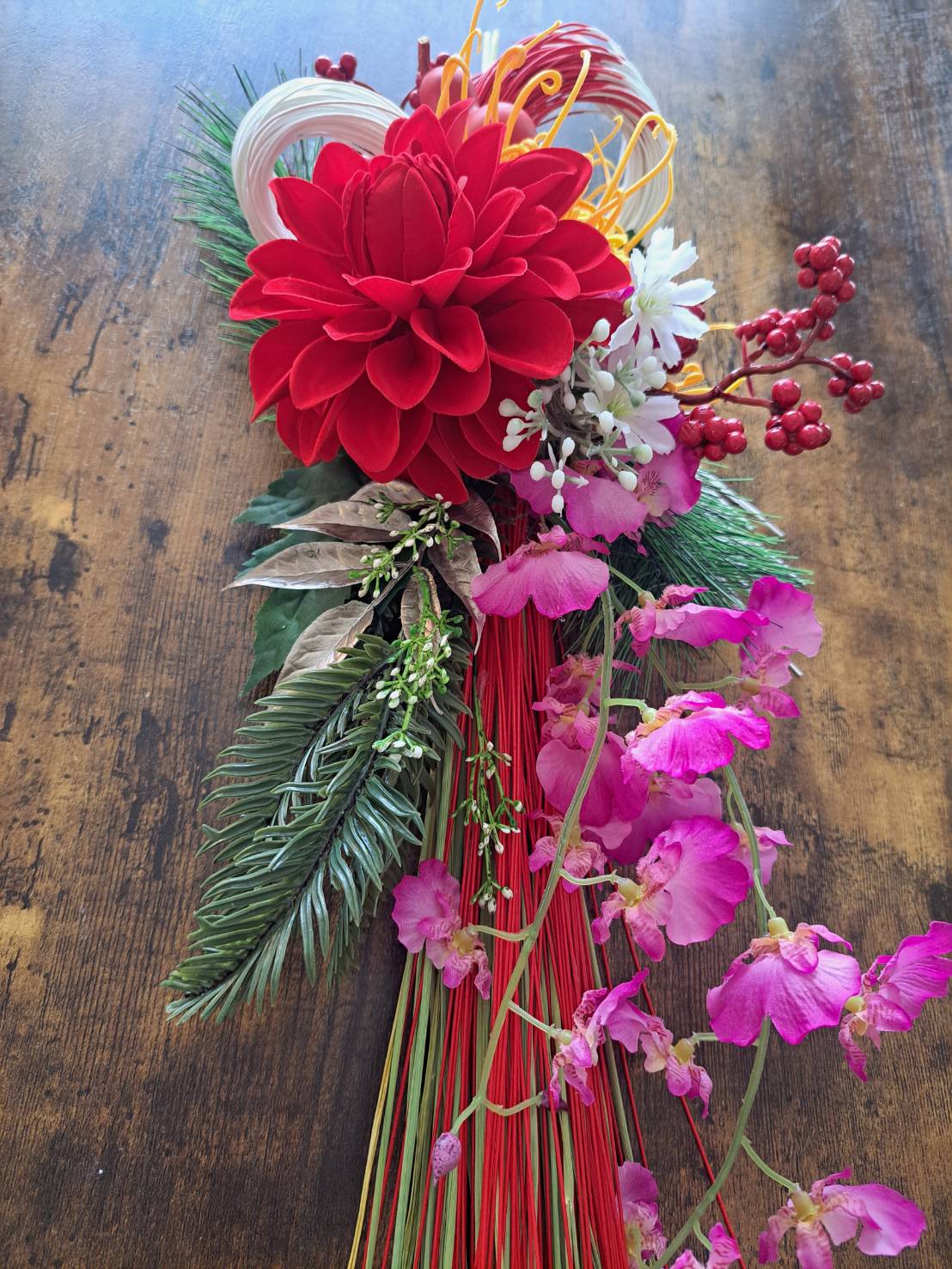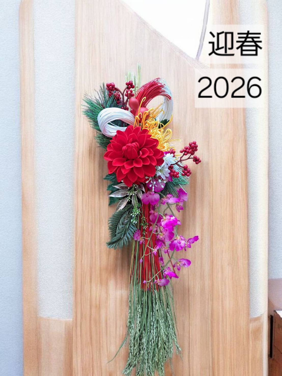 お好きなお花と紅白の水引を使ってお家に似合う、オリジナルのしめ飾りを作りませんか?