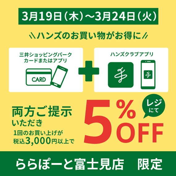 レジにて「三井ショッピングパークポイントカードまたはアプリ」と「ハンズクラブアプリ」の両方をご提示いただき、1回のお買い上げが税込3,000円以上であれば、そのお会計が5%OFFになるキャンペーンを開催します。