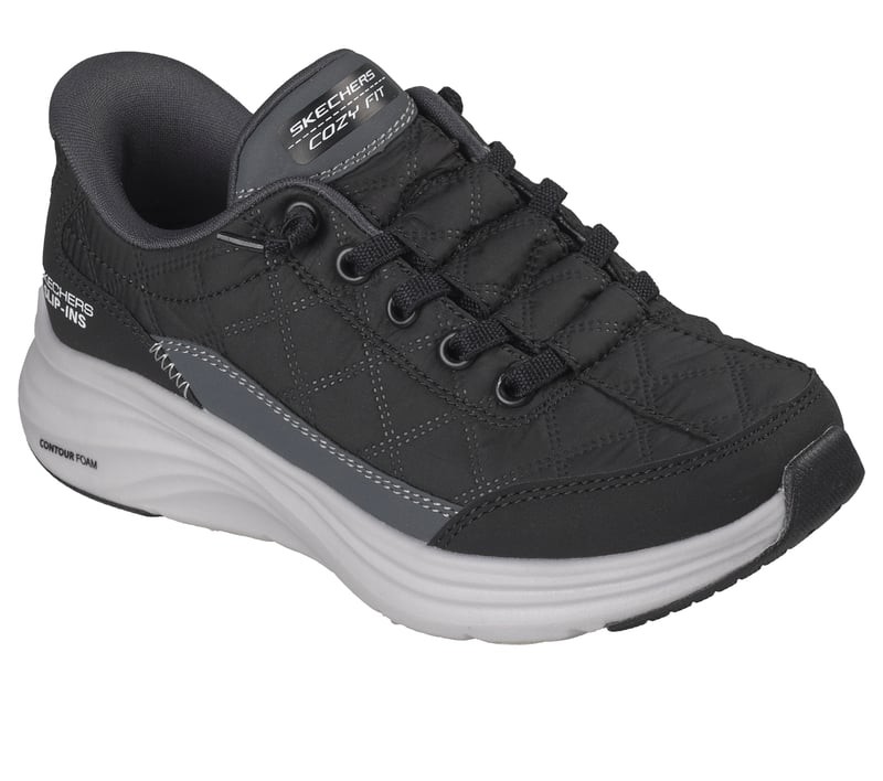 Heel Pillow™(ヒールピロー)デザインを採用したスリップオンシューズ。Cozy Fit™(コージーフィット)キルティングと合成素材のオーバーレイアッパー、固定式ストレッチレース、クッション機能搭載のContour Foam™(コンツアーフォーム)ミッドソール、クッション性のあるSkechers Air-Cooled Memory Foam™(スケッチャーズ エアクールドメモリーフォーム)インソールが特長です。