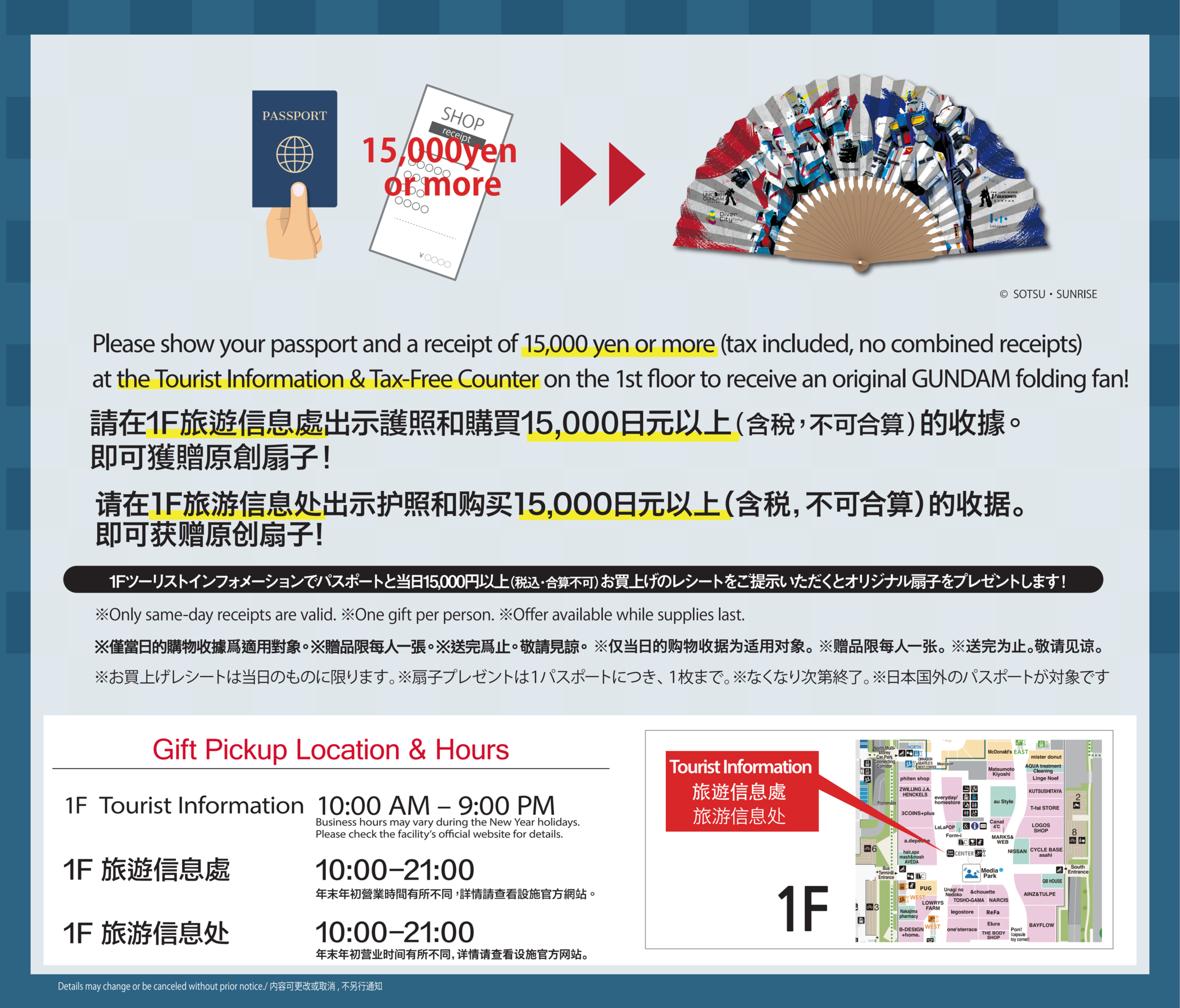 Show your passport and a receipt of 15,000 yen or more (tax included, no combined receipts) at the Tourist Information & Tax-Free Counter on the first floor to receive an original GUNDAM folding fan!