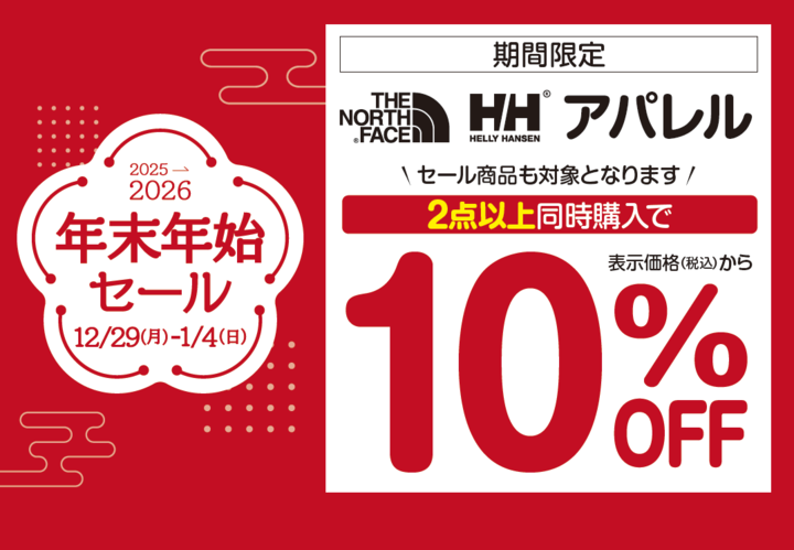 【年末年始セール】ノースフェイス・ヘリーハンセンのアパレルを2点以上同時購入で10%OFF!