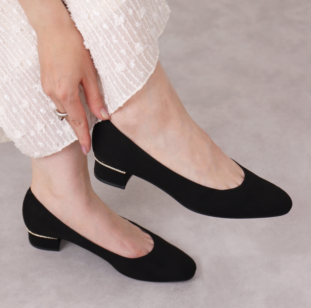 ヒールの付け根をぐるりとしたビジューが華やかで上品なスエード調プレーンパンプス。