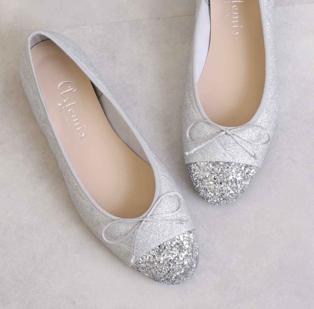 ラメをキルティング加工したオリジナル素材と、同系色の大粒グリッターの組み合わせが華やかなバレエシューズ⭐︎