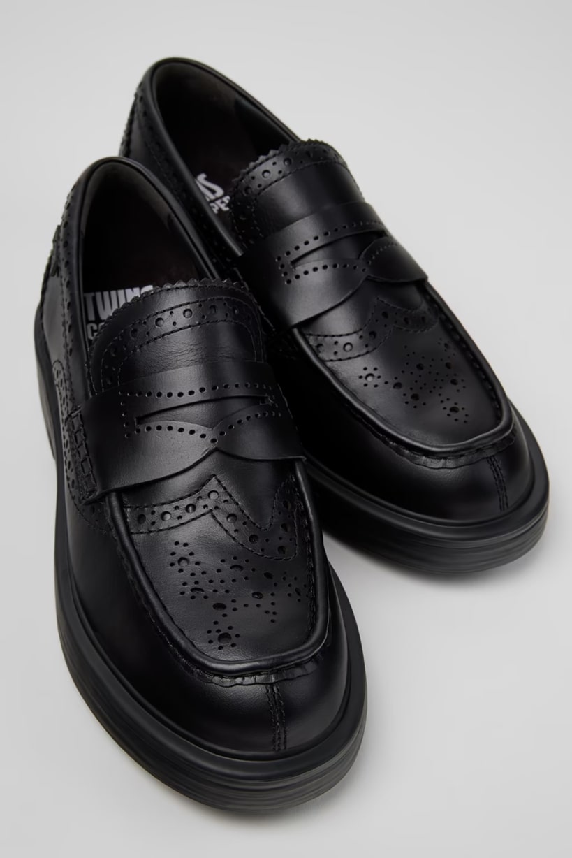 パンチングで装飾したメダリオンを左右非対称に配したローファー、