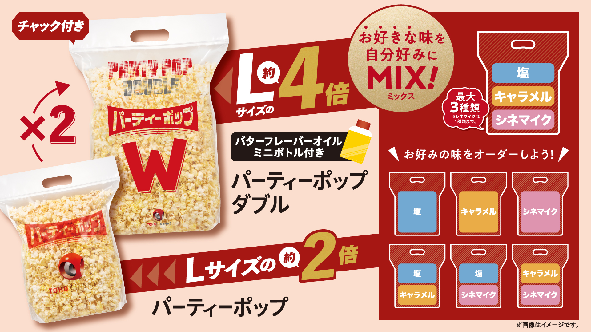 当社Lサイズの約2倍!塩、キャラメル、シネマイクの最大3種類をMIXできます。BIGなポップコーンを楽しもう!