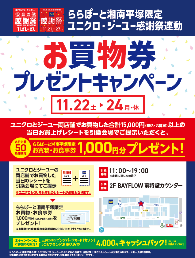 ユニクロとジーユー両店舗でお買物した合計15,000円(税込・合算可)以上の当日お買上げレシートを引換え会場でご提示いただくと、各日先着50名様限定でららぽーと湘南平塚限定 お買物・お食事券1,000円分プレゼント!