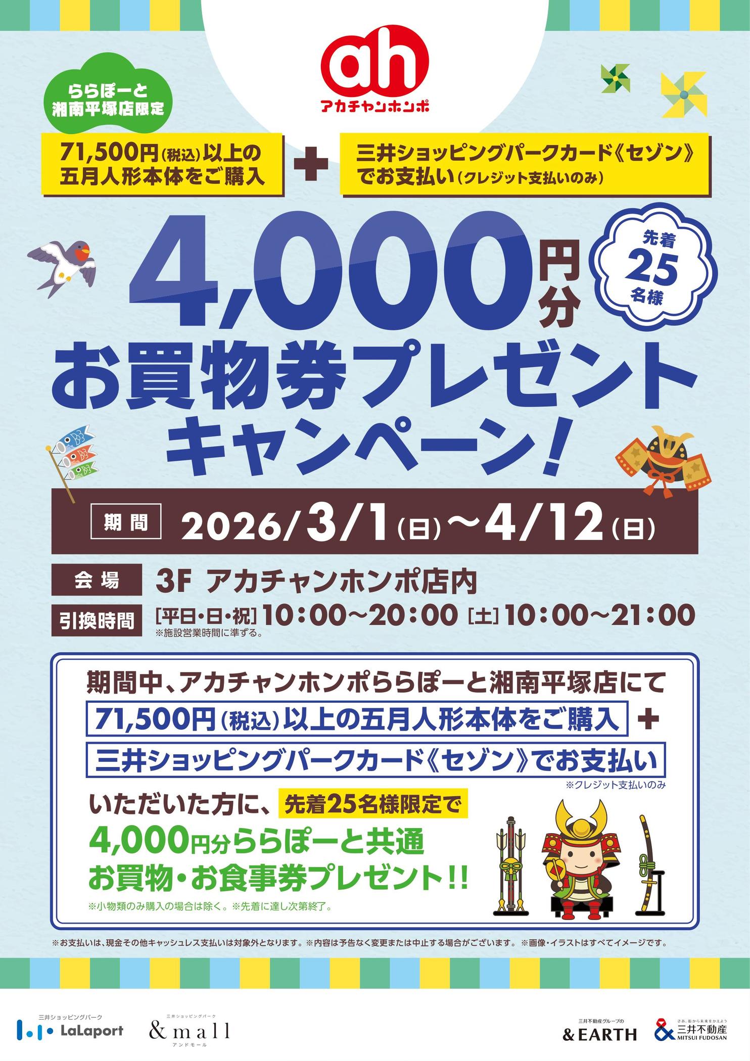 71,500円以上の五月人形本体を三井ショッピングパークカード《セゾン》でお支払い頂いたお客様先着25名様に、ららぽーと対象店舗で使える4,000円分のお買い物券をプレゼント!