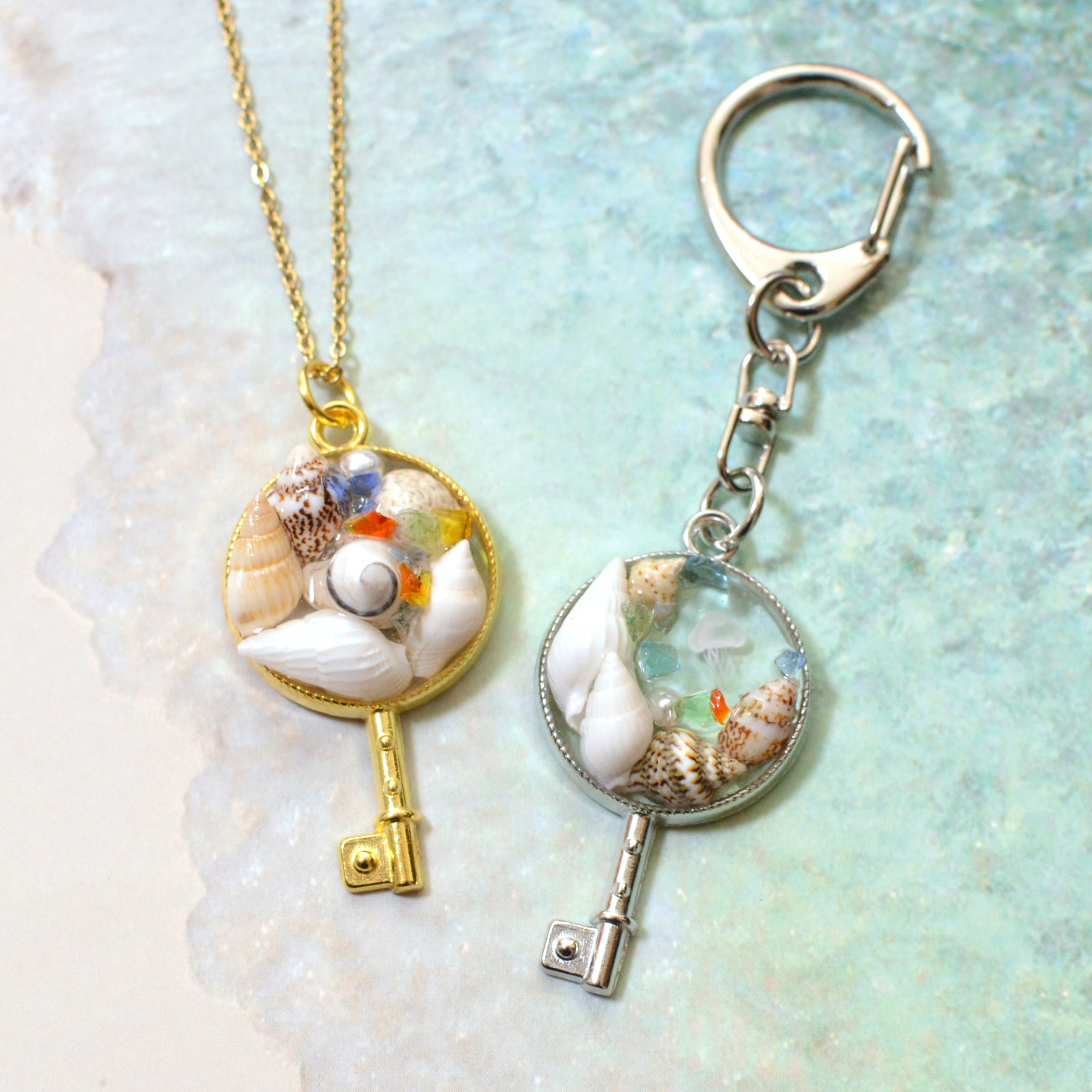 お好きな色の天然石や貝殻、シーグラスをレジンでとじこめて、オリジナルアクセサリーを作