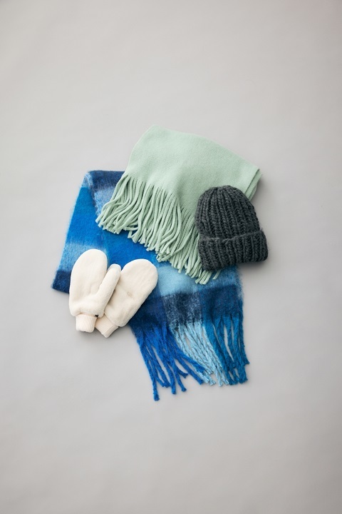 ②柔らかなニット素材とフリンジが可愛らしいソフトタッチストール。フリンジデザインがさりげないアクセントになり、コーディネートに動きをプラス。