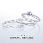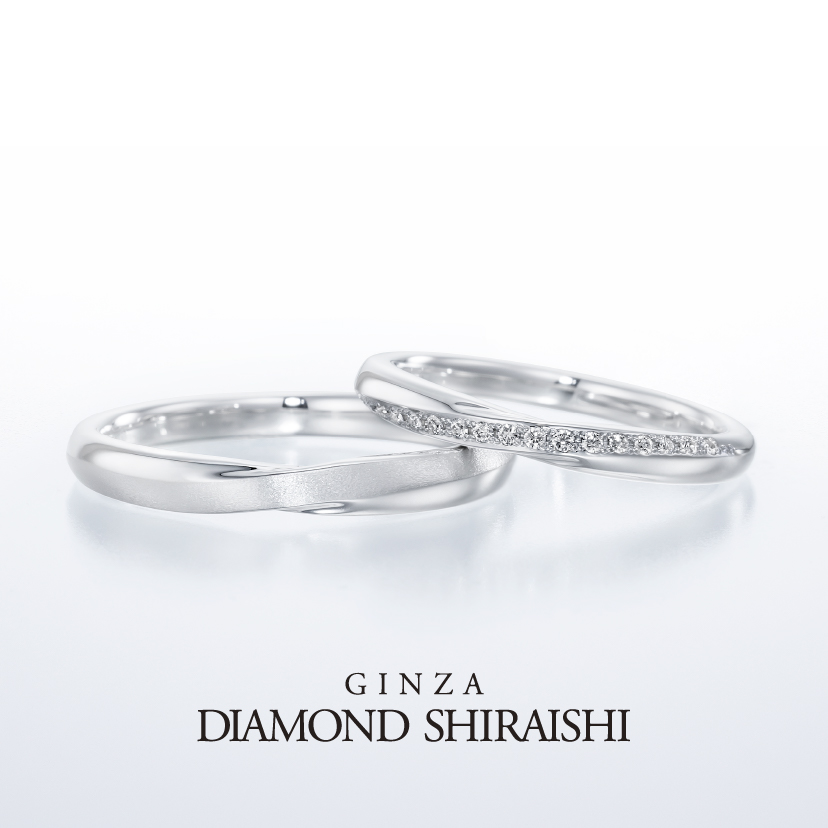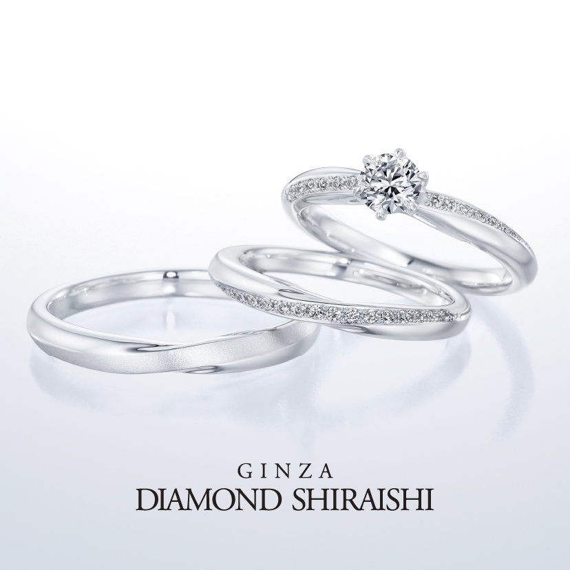 エンゲージリングとマリッジリングを重ねて着けると2本のメレダイヤモンドのラインが、まるで植物が絡み合うようにやわらかく重なり、途切れずに続く輝かしい未来を連想させます。