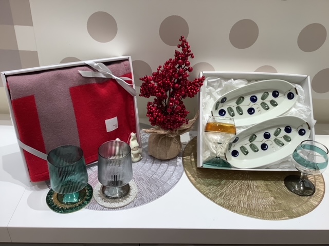 食卓を彩るワイングラスや大皿、これからの寒い季節にカラフルなマフラーやニット、ブランケットなどもおすすめです。