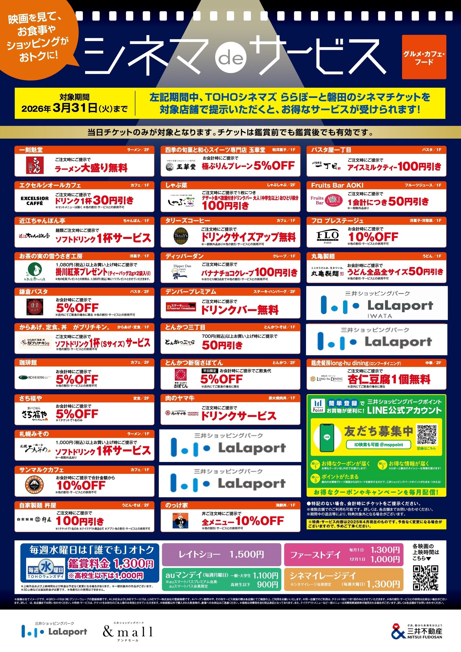 TOHOシネマズ ららぽーと磐田のシネマチケットを、対象店舗へご提示いただくと、お得なサービスが受けられます!