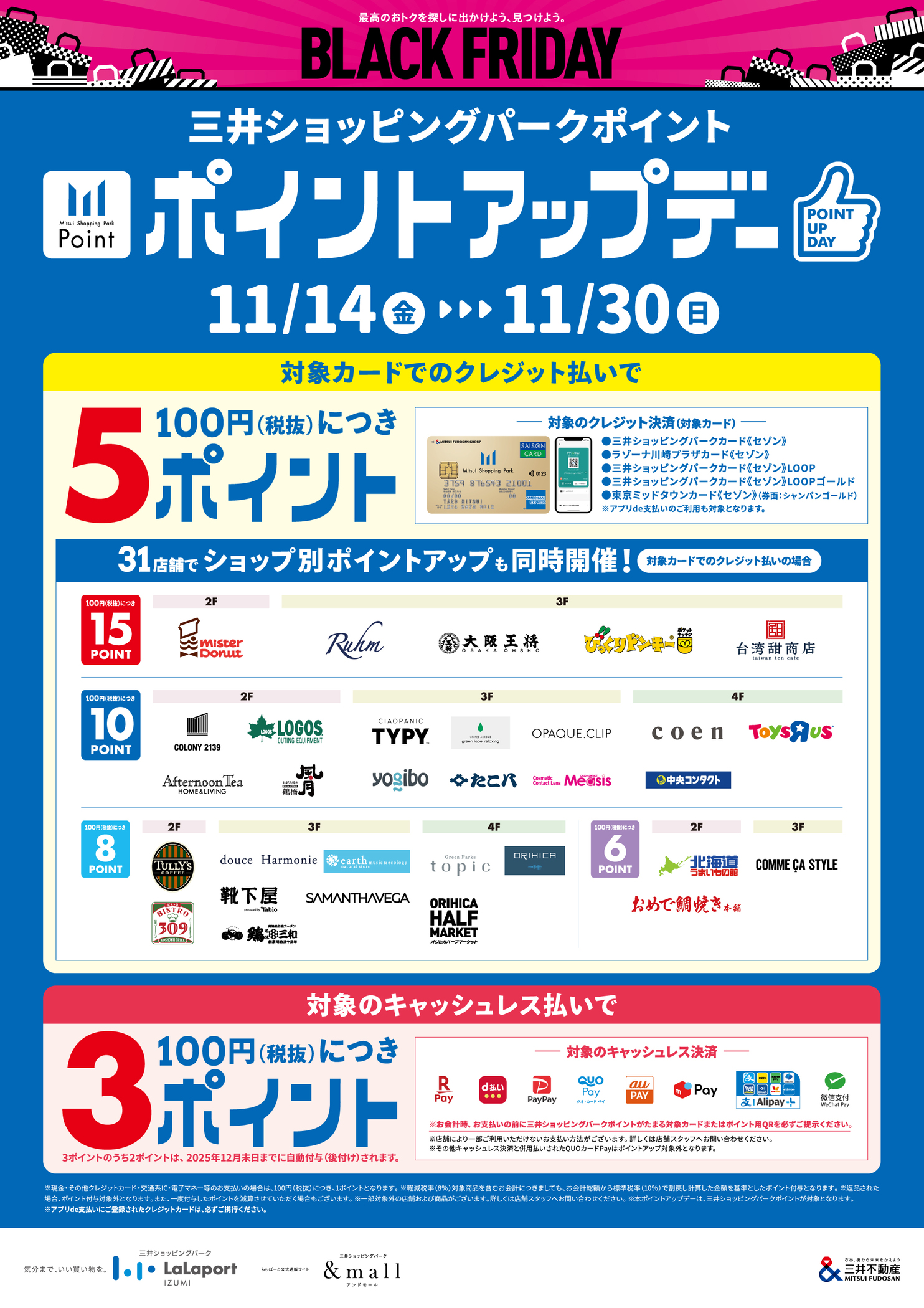 - 11/14(金)~11/30(日)三井ショッピングパークポイント ポイントアップデー開催!