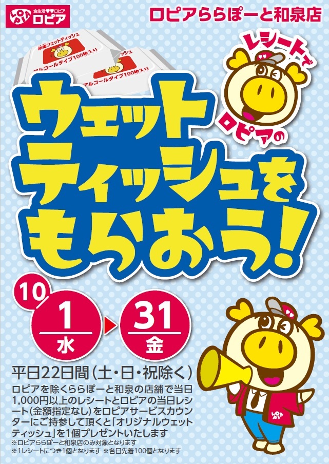 ららぽーと和泉内の ロピア以外の店舗で当日お買い物した1,000円(税込)以上の店舗レシートとロピアららぽーと和泉店でお買い物したレシート(金額指定なし)を、ロピアららぽーと和泉店のサービスカウンターへご持参して頂くと、ロピアのウェットティッシュを1個プレゼントいたします!