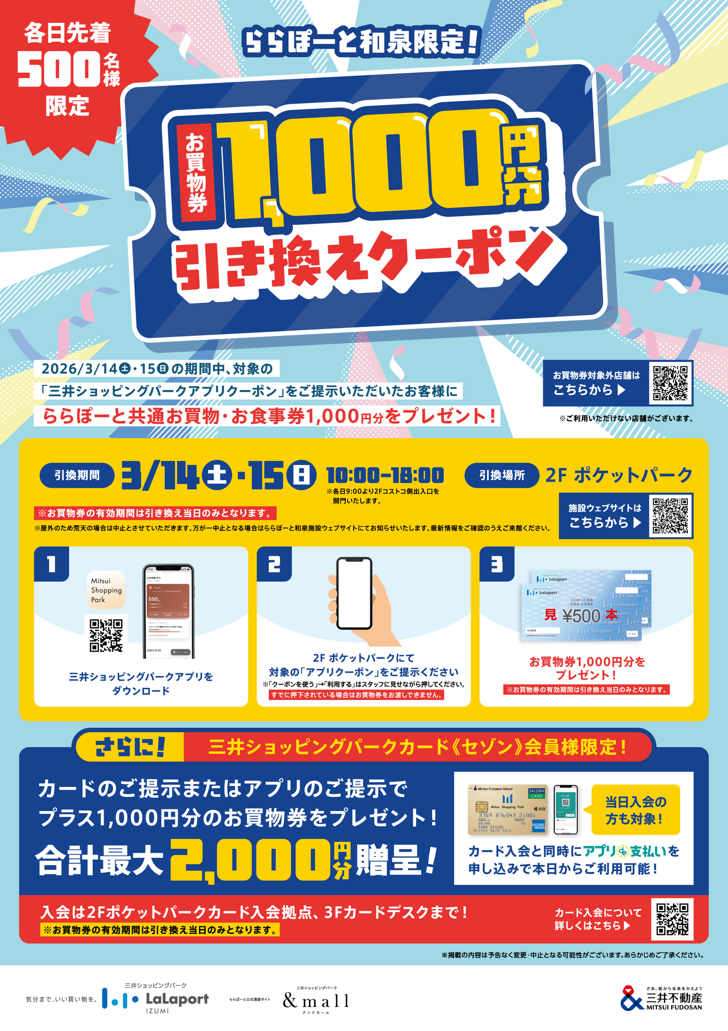 期間中、対象の「三井ショッピングパークアプリクーポン」をご提示いただいたお客様にららぽーと共通お買物・お食事券1,000円分をプレゼント!