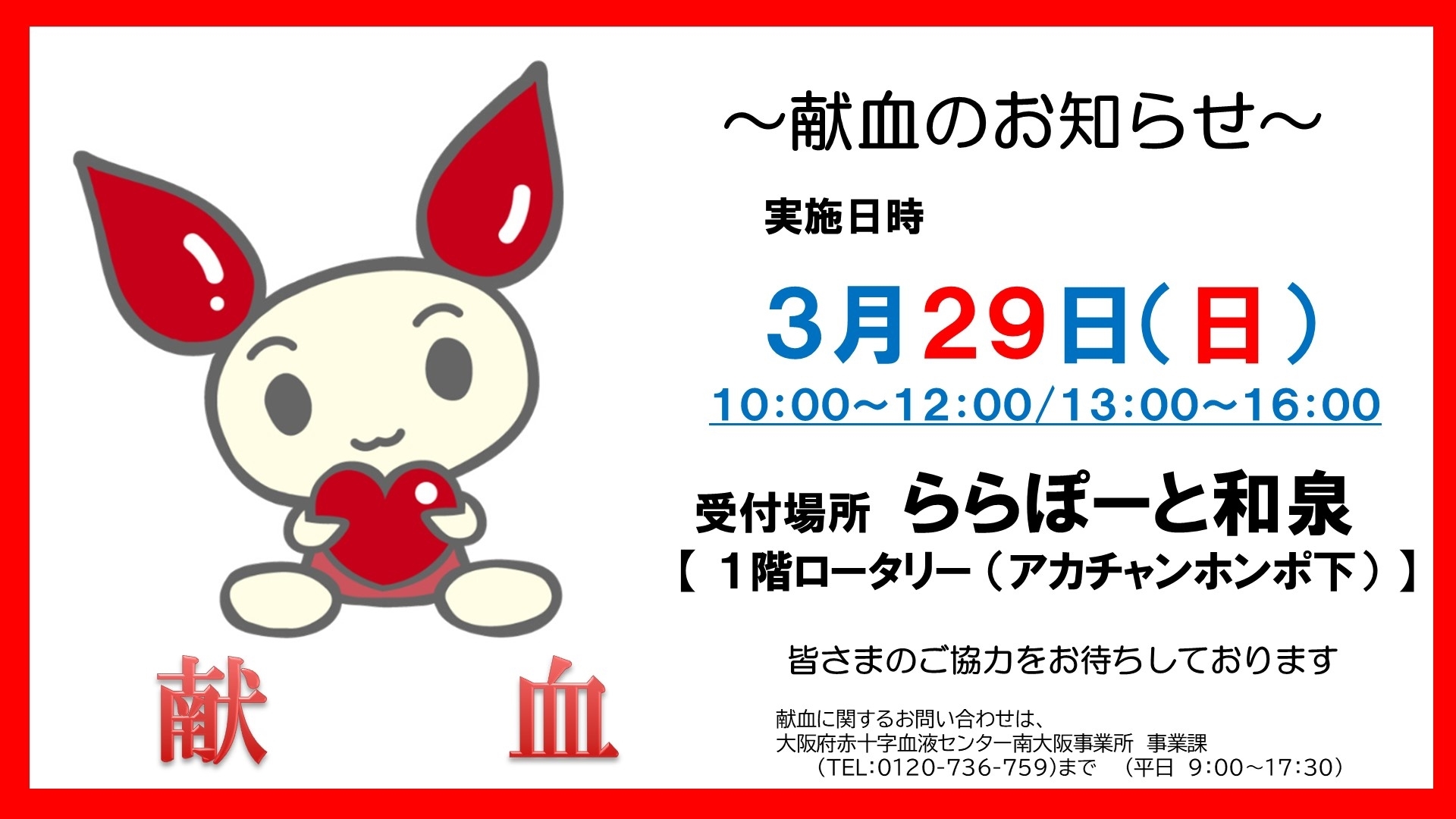 大阪府赤十字血液センター 南大阪事業所 TEL:072-423-3001 (平日9:00~17:30)