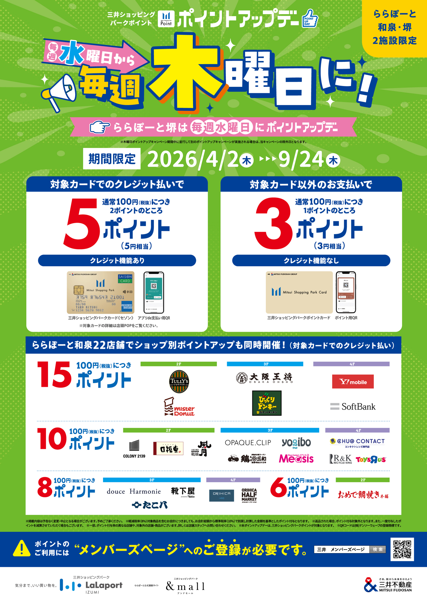 - <毎週木曜日>曜日が変わりました!木曜日限定ららぽーと和泉 三井ショッピングパークポイント ポイントアップデー!