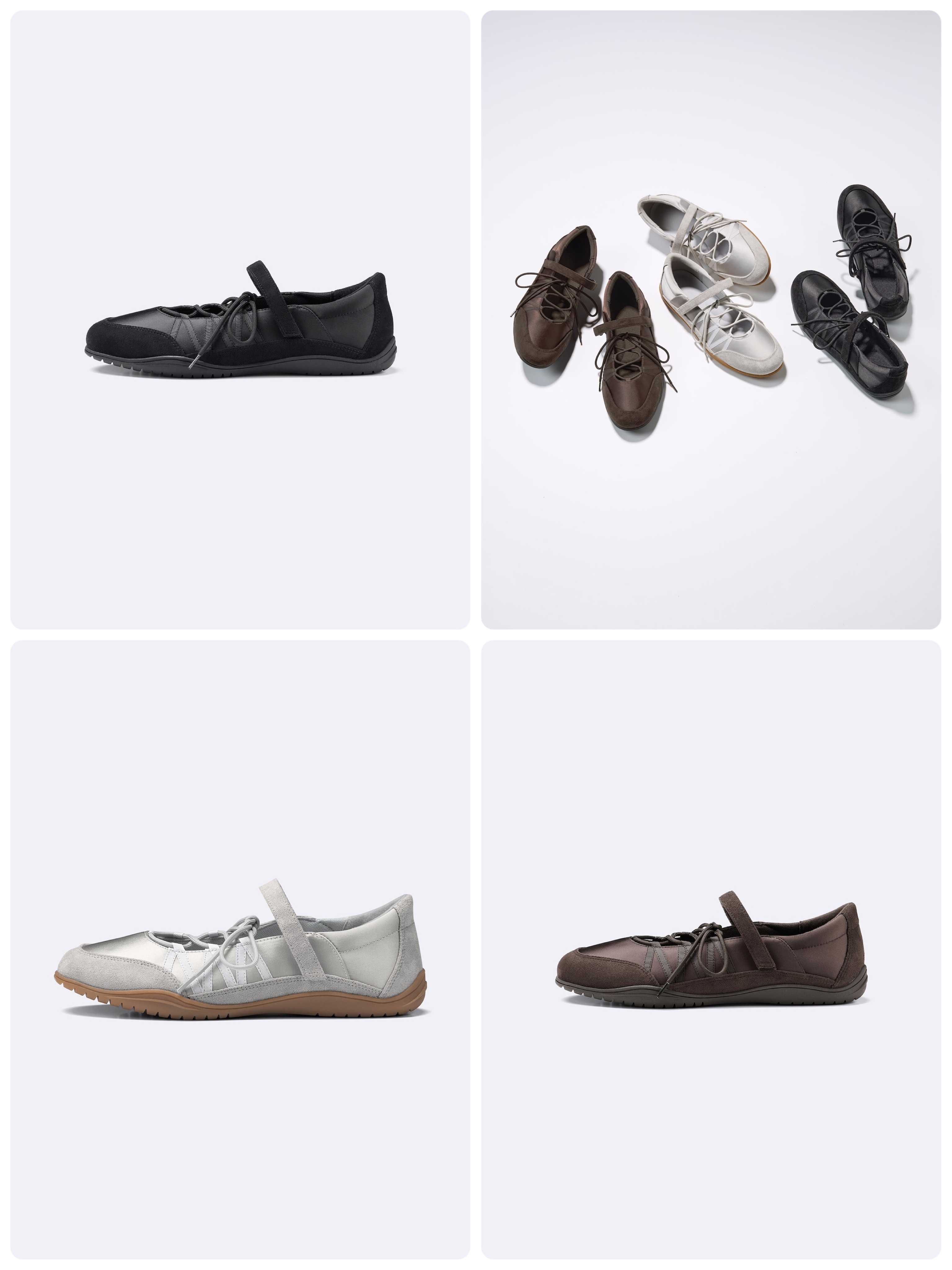 バレエシューズのデザインとスニーカーの快適さを掛け合わせたハイブリットな仕様。アーチサポート付きのカップインソールで土踏まずを支え疲れにくい。