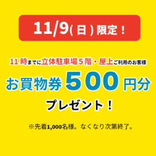 - 【11/9(日)限定】11時までに立体駐車場5F・屋上ご利用でお買物券プレゼント!