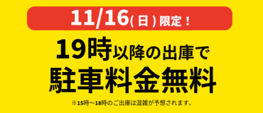 - 【11/16(日)限定】19時以降の出庫で駐車料金無料!