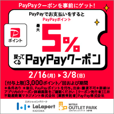2/16(月)~3/8(日)の期間、事前にPayPay内でクーポンを取得いただき、対象店舗にてPayPayをご利用のうえお支払いいただくと最大5%分のPayPayポイントが後日付与されます。