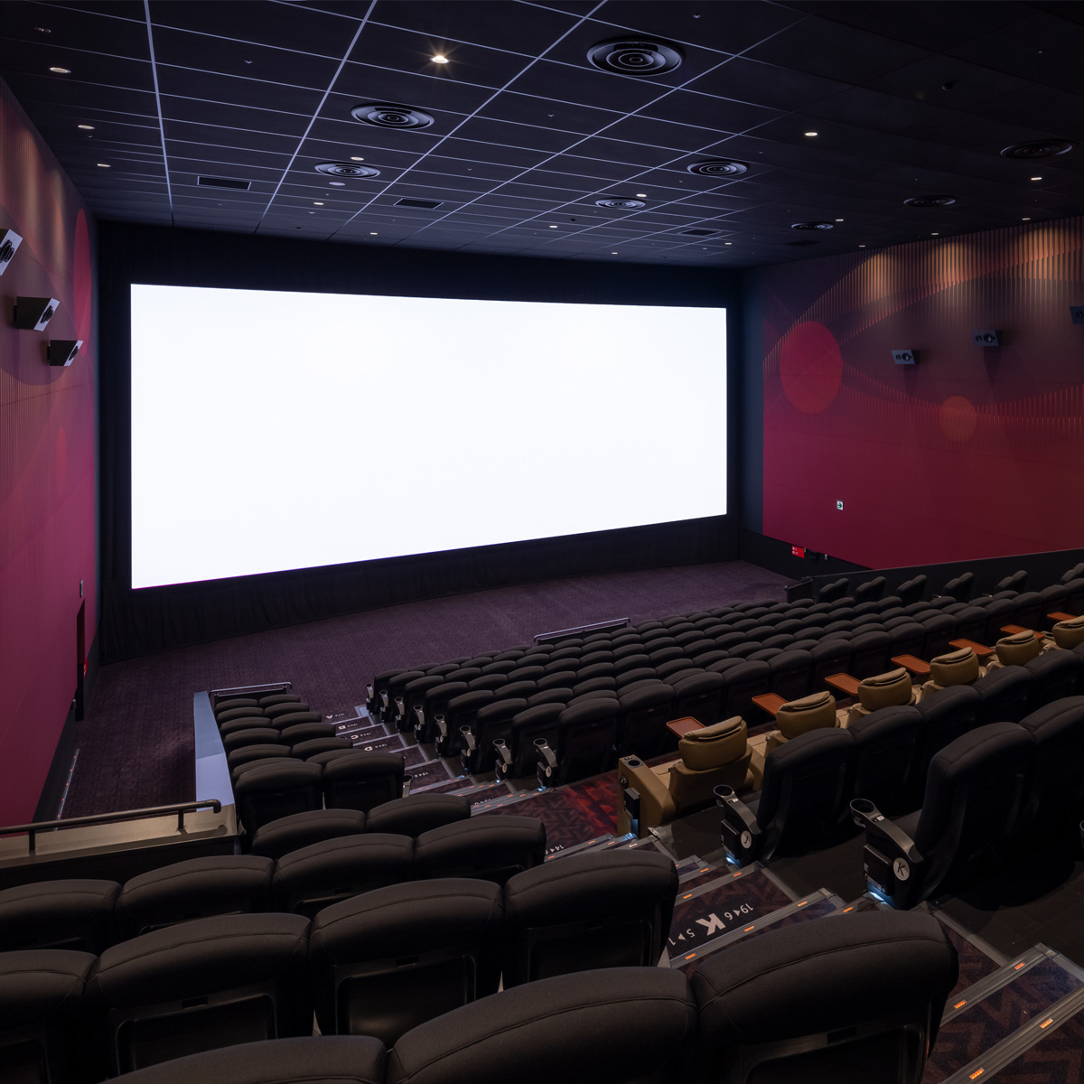 映画館にとって「映像」、「音響」、「座席」は重要な要素であり、これらの本質を追求し、こだわり抜いたのが、TOHOシネマズのハイエンドシアターである「プレミアムシアター」です。左右の壁いっぱいまで拡大された巨大スクリーン(プレミアムラージフォーマット)、シアター形状に最適化した形でスピーカーをカスタマイズした良質な音響(プレミアムサウンド)、プライベート空間が確保された広々とした座席(プレミアムシート)を兼ね備えたTOHOシネマズ独自規格の高品質シアターです。