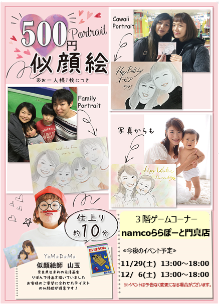 11/29(土)13:00からゲームコーナー店頭にて似顔絵イベントを実施します。