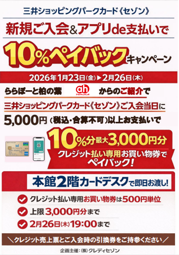三井ショッピングパークカード〈セゾン〉 新規ご入会&アプリde支払いで 10%ペイバックキャンペーン