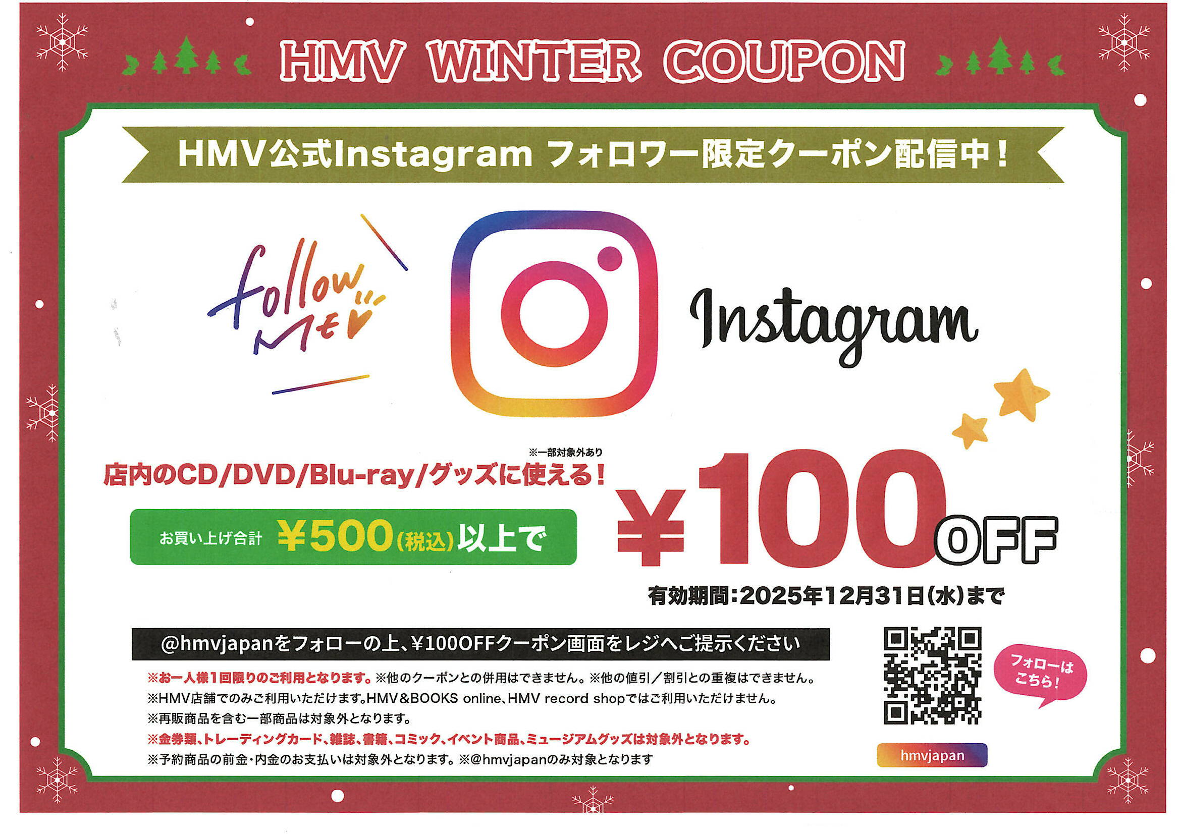 HMV公式Instagramをフォロー&投稿画面をご提示で¥500以上お買い上げ時に¥100オフ