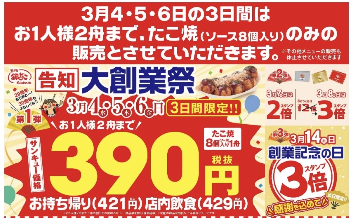 さらに!第3弾は、築地銀だこ 「創業記念日」 にあたる 3月14日(土)も、スタンプ “3倍”! を実施いたします!!
