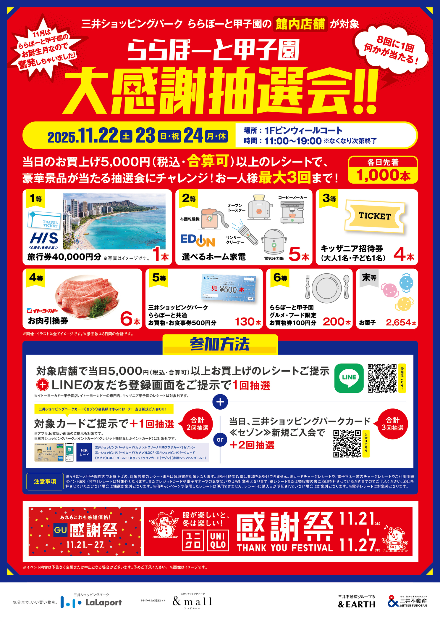 ・ららぽーと甲子園館内でお買上げの、対象店舗のレシートまたは領収書が対象です。