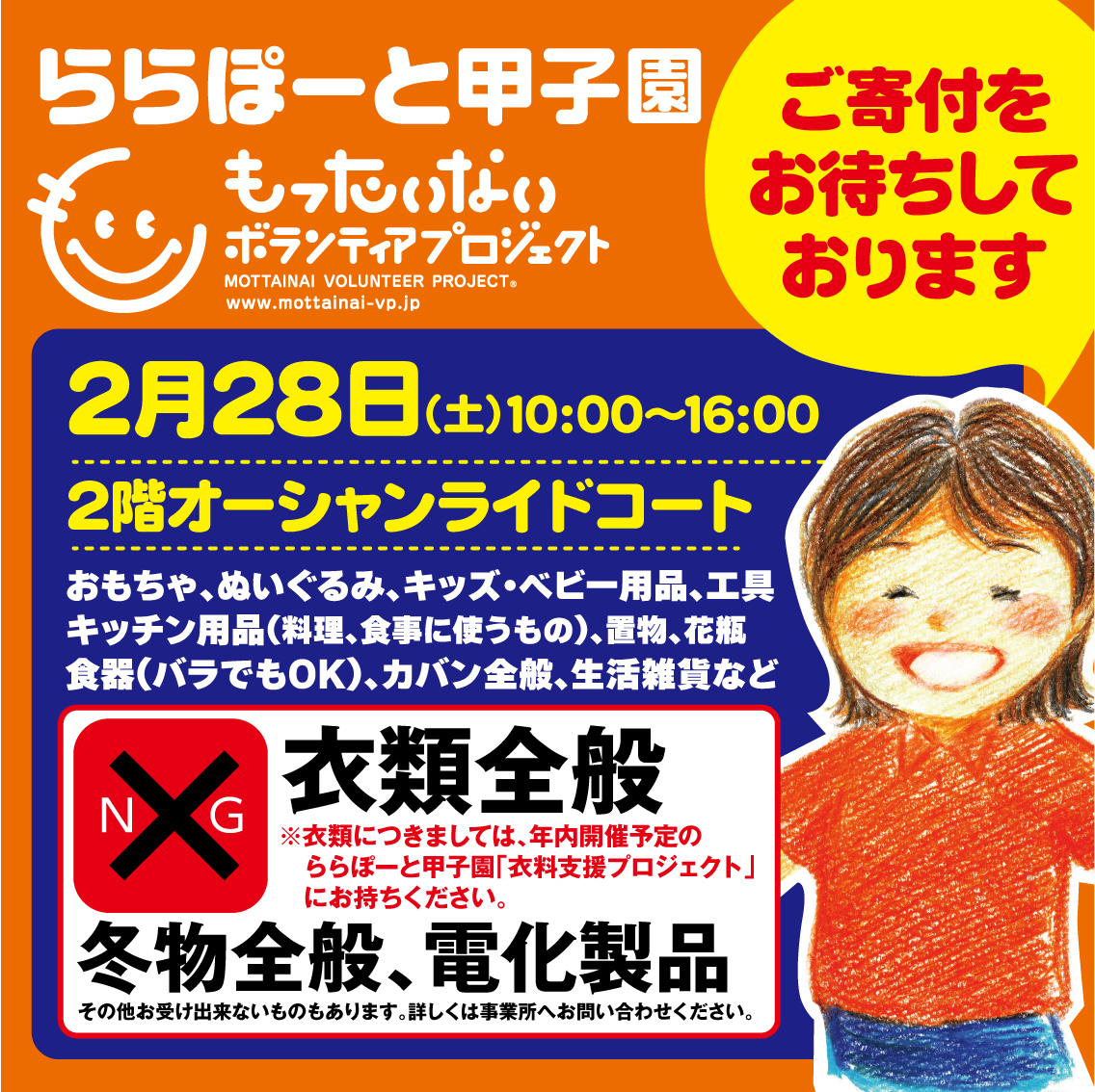 ※衣類につきましては、同日開催予定のららぽーと甲子園「衣料支援プロジェクト」にお持ちください。
