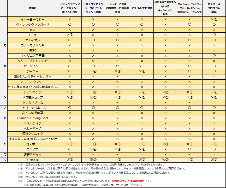 三井ショッピングパークポイントに関するサービスが異なる店舗、アプリde支払い対象外店舗について