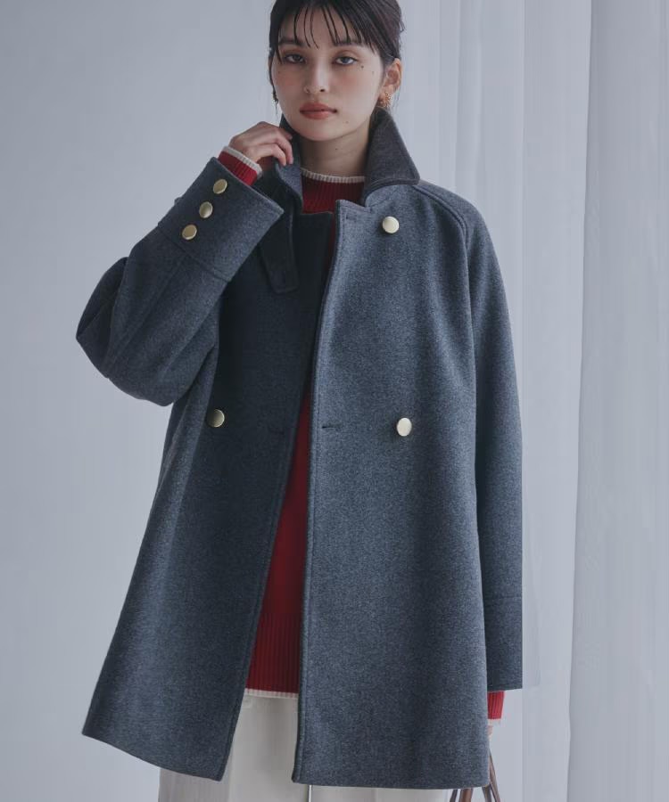 スタンドネックのハーフコートは、W前後しようの金ボタンデザインが印象的な一着です。
