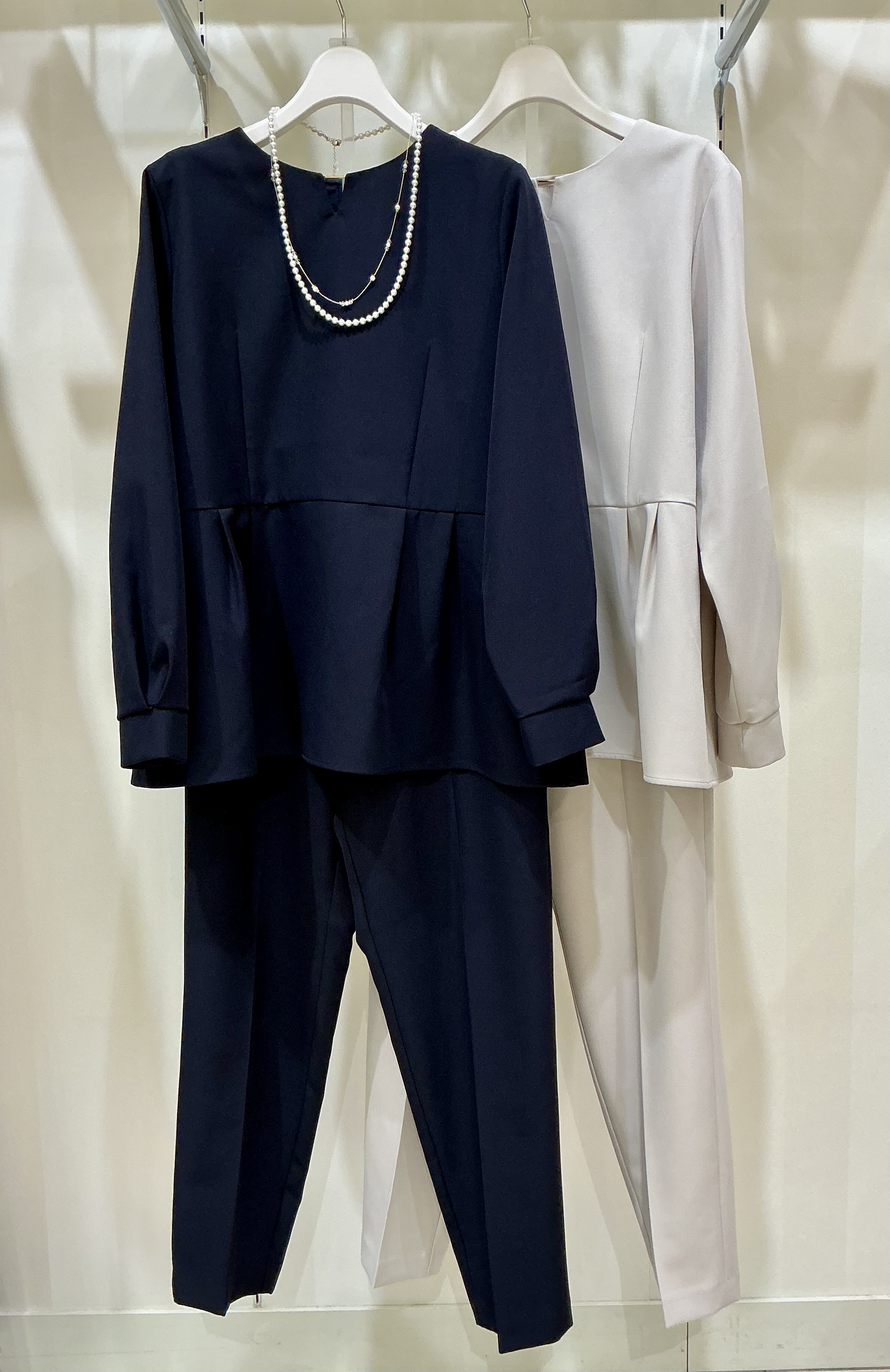 ブラウスは広がりすぎないペプラム×長めのダーツでお腹とヒップ周りをカバーしてくれます。