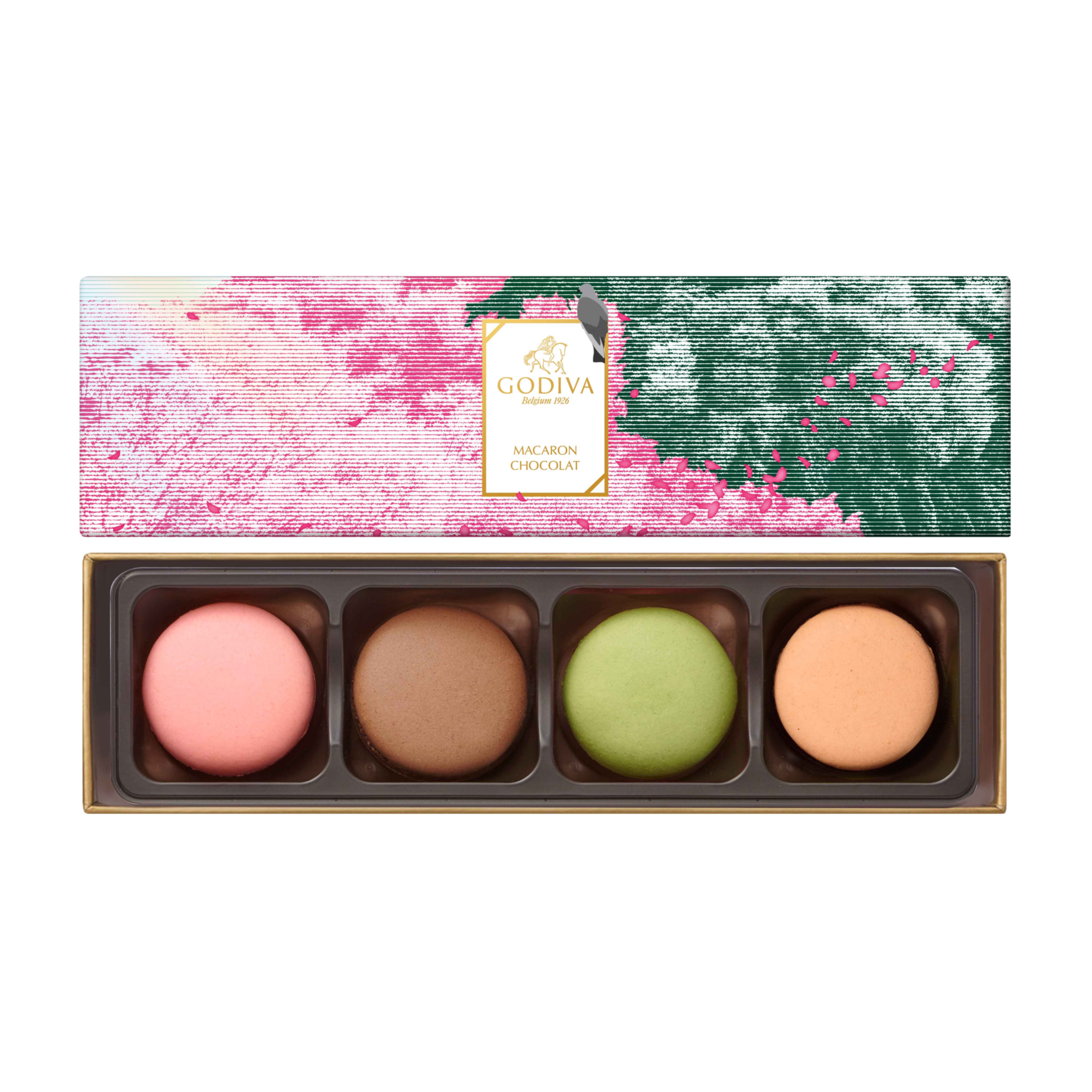 チョコレートソースやキャラメルソースを閉じ込めた贅沢なドーム型のチョコレートと目にも鮮やかなマカロンでガナッシュをサンドしました。食感の異なるチョコレート、マカロン、ガナッシュのマリアージュをお楽しみください。期間限定の「桜&ホワイトチョコレート」と「塩キャラメル」「宇治抹茶&ミルクチョコレート」「ミルクチョコレート」の4種のフレーバーをカラフルに詰め合わせました。