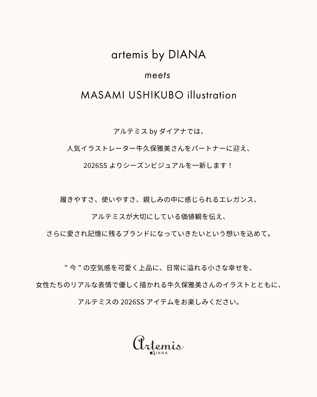 アルテミス by ダイアナでは、人気イラストレーター牛久保雅美さんをパートナーに迎え、2026SSよりシーズンビジュアルを一新します!