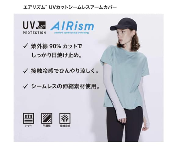 1FエアリズムUVカットシームレスアームカバー990円紫外線90%カットでしっかり日焼け止め。接触冷感でひんやり涼しくシームレスの伸縮素材使用。